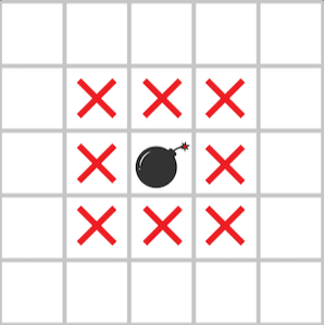 다음 그림과 같이 지뢰가 있는 지역과 지뢰에 인접한 위, 아래, 좌, 우 대각선 칸을 모두 위험지역으로 분류합니다.